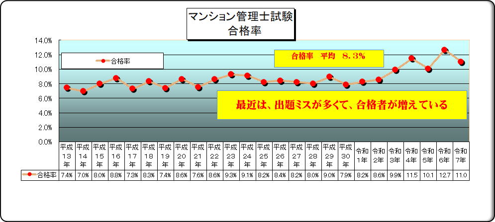 基本的に、マンション管理士試験では、合格率上位 8% を目標にしていたが、最近は、度重なる出題ミスが連続していて、この8%が守れなくなっている。