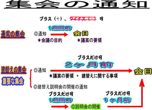 *伸縮することができる...会日の1週間前に、「目的」を示して、通知を出す。この1週間の期間は伸ばしたり、また短めることが別途規約で定められる。(注意:これを受け標準管理規約(単棟型)では伸ばして「2週間前」としている(標準管理規約(単棟型)43条1項)