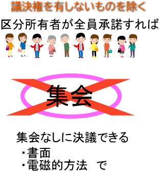 区分所有法第45条3項「この法律又は規約により集会において決議すべきものとされた事項についての書面又は電磁的方法による決議は、集会の決議と同一の効力を有する」の規定により、決議要件は集会の決議と同一。