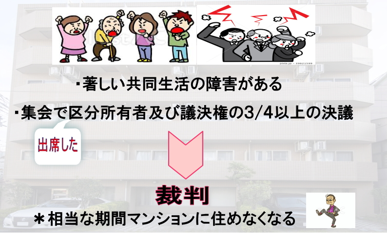 1項によれば、占有者が占有する専有部分の使用又は収益を目的とする契約の解除及びその専有部分の引渡しを請求するには、集会の決議に基づき、訴えをもってします。