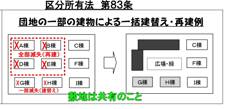 令和7年(2025年)5月に成立した「老朽化マンション等の管理及び再生の円滑化等を図るための建物の区分所有等に関する法律等の一部を改正する法律」によって、以前は、被災区分所有建物の再建等に関する特別措置法(被災マンション法)に規定されていた災害を受けた一棟の「専有部分のある建物」が全部滅失した場合の「再建」や「敷地売却」と共に、これも被災マンション法で規定されていた「団地内の建物」が被災した時の団地で「再建」や「敷地の売却」などを区分所有法内に取込んだものです。